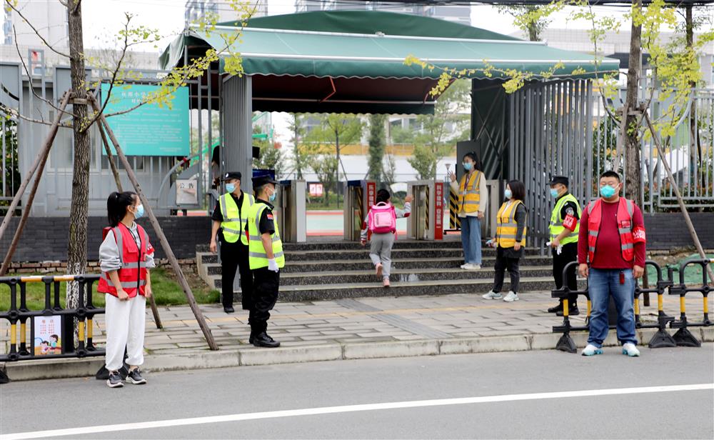 根据上下学时间,学校科学部署,要求“护学岗”队伍成员提前20分钟到岗,对在校门口等待的学生、家长进行疫情防控宣传,提醒他们不要扎堆,规范佩戴口罩;对校门口和周边道路的交通秩序进行引导,提醒过往车辆和家长遵守交通规则,注意避让学生,引导学生在安全区域内行走。